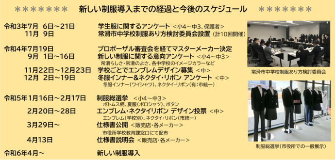 本市の取組みの特色としては、導入までのプロセスを大切にし、児童生徒の意向把握や参画の機会を積極的に確保してきたこと、様々なデザインの中に「常滑らしさ」を表現してきたこと、新しい制服の納品遅れが生じないよう、県内導入事例で最早レベルの3月中に仕様書を公開することが挙げられます。